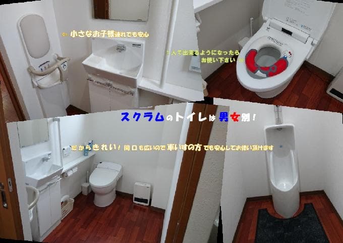 スクラムのトイレは男女別です だから きれい! 間口も室内も広いのでお子様連れでも安心です もちろん車いすの方もOK 男性は開放的なひと時をご満喫下さい